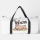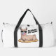 This white duffle bag features a charming cartoon llama wearing sunglasses and blowing a bubblegum bubble, with the text "NO DRAMA, JUST LLAMA." This quirky and humorous design is perfect for those who appreciate a peaceful, fun-loving attitude. Edit color of the bag caps and body in the Design tool to your favored colors.