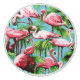Nostalgisches und cooles Design in hellen Farben mit rosa Flamingos und grünen Palmen vor tiefblauem Hintergrund.