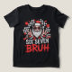 Santa Claus wearing star-shaped glasses, making a peace sign, with the phrase SIX SEVEN BRUH. Cool outfit for your Christmas party!