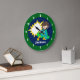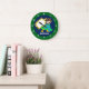 Individuelle Superheld-Kinderzimmer Wanduhr personalisiert mit dem Namen Ihres Kindes. Ein phantastisches Superkind in blauen und grünen Kostümen.