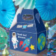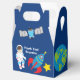Eine coole Astronautenthemenbox für ein Gastgeschenk zum Geburtstag eines Kindes. Enthält einen phantastischen Kinderastronauten neben einem Raketenschiff in der Galaxie. Die Seiten sind mit Planeten, Raumschiffen und dem Planeten Erde dekoriert. Passen Sie mit Ihrer Dankeschön-Nachricht für ein Galaxy-Gastgeschenk-Paket an.