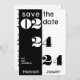 Wow Ihre Gäste mit Ihrem coolen Hochzeitstag und diesem einzigartigen Save the Date, das Ihr besonderes Datum unterstreicht. Dieses typografische Design setzt den coolen Datumsplatz voraus. Weiß, Schwarz und Schwarz auf weißen Zahlen sind dramatisch elegant. Auf der Rückseite ist Platz für eine Nachricht mit den vorläufigen Details sowie ein QR Code für Ihre Hochzeitswebsite. Beispieldatum ist 022424, aber es funktioniert für andere coole Daten und wiederholte Zahlen in den Jahren 2024 und 2025, wie 042024, 082424, 052025 und 062026. Farben können im Designwerkzeug angepasst werden.