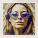 Coole Ai-Kunst, die eine Frau in lila Hippie-Sonnenbrillen mit einer scharfen Reflexion darstellt.
