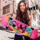 Dieses lebendige Kunstwerk, das unter Verwendung einer einzigartigen Technik der gemischten Mediengrafik erstellt wurde, ist eine exquisite Darstellung eines bezaubernden Mädchens auf einem Skateboard vor einem Hintergrund von Wirbel und Regenbögen!