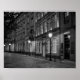 Abend Blick auf alte, historische Gebäude und Kopfsteinpflasterstraße in Altstadt Düsseldorf. Die Leute laufen in unscharfer Bewegung. Schwarz-Weiß-Fotografie im europäischen / deutschen Architekturstil.