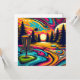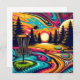 Retro-Disc-Golfplatz mit psychedelischem Sonnenuntergang, Vollmond, wirbelnd farbiges Wasser.