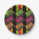 80erart, Papierplatten des hellen retro Kassettenneonmusters schwärzen Hintergrund, der zu jeder möglicher Farbe mit dem retro 80erentwurfsblick geändert werden kann, der die hellen, Neonstreifen im grünen, orange und rötlichen Rosa mit Reihen der alte Schulkassettenbänder in zusammenpassenden Neonschatten zeigt. Cooler PapierTeller für ein retro 80erthema-Party für einen Babyboomergeburtstag. Einzigartigerer PapierTeller ist in unserem Zazzle.com/angela65*-Speicher für Ihre besonderen Anlässe.