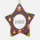 Ein Ornament, das mit einem niedlichen Camping-Muster entworfen wurde. Camping-Themen wie ein orangefarbenes Lagerfeuer, ein grünes Zelt, eine akustische Gitarre und andere Naturelemente wie Bäume, Blätter, aber auch ein Rucksack, Schaufel und Kantine. Coole Outdoorsie. Ein weißer Kreis lag oben mit einem personalisierten Namen innen.