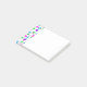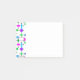 Dieses Post-It-Notizblock hat ein modernes Design aus einem Gitter aus horizontalen und vertikalen schwarzen Linien mit Rechtecken in verschiedenen lebhaften Farbtönen grün, blau und lila.