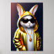 Niedlich cool mit humanoidem, weißem Hasen mit goldgelbem Kapuze, Halskette und dunkler Sonnenbrille.