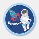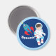 Ein cooles Weltraummagnet-Geschenk für ein Kind, das die Planeten und Raumschiffe Liebe. Ein Astronaut in einem Raumanzug aus Rot und Blau, der am Himmel neben einem Raketenschiff schwebt. Passen Sie den Namen Ihres Kindes in Weiß auf dem dunkelblauen Hintergrund an und hängen Sie mit diesem am Kühlschrank auf.