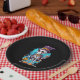 Papier Teller mit einer Illustration eines humorvollen Skeletts. Tragen Sie einen Tophut, halten Sie ein Getränk. Er hat ein großes Lächeln im Gesicht. Zu Halloween macht sich niedlich und spukhaft viel Spaß.