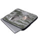Dieser phantastische Laptop-Ärmel zeigt ein Foto von einer Coot und ihr Küken schwimmen auf einem Flussufer. Das Weibchen ist grau mit einem weißen Pflaster auf dem Kopf und roten Augen, während das winzige, flauschige Küken mit einer weißen Vorderseite blassgrau ist.