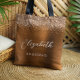 This elegant modern bridesmaid tote bag features a copper faux glitter border. Add her name in white handwriting script and the word "bridesmaid" or other title in sans serif font on a copper faux brushed metal background.