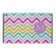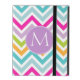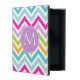 Coque ipad moderne fait dans un joyeux rose, lavande, vert, aqua, jaune et blanc chevron motif zigzag. Un disque rond couleur lavande, à l'avant, a un grand monogramme blanc d'une lettre. Personnalisez la lettre pour vous-même ou comme une idée de cadeau sucré.