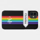 Ce coque personnalisé Coque-Mate iPhone 11 a un motif à bandes verticales de couleur arc-en-ciel au centre avec un ruban de bannière blanche courant horizontalement sous la caméra qui a couture blanche et des lettres blanches que vous pouvez customiser avec votre nom ou autre texte. Il y a aussi un monogramme de 3 lettres centré en bas. L'arrière - plan noir peut être changé pour n'importe quelle couleur. Vous serez fiers de vous montrer ce nouveau coque moderne et branché qui fait une déclaration chic ! Si vous avez besoin d'aide, envoyez un courriel à niteowlstudio@gmail.com.