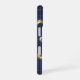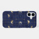 This phone case features a deep navy background with elegant gold crescent moons and a geometric grid pattern. A perfect blend of celestial charm and modern sophistication.