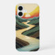 A peaceful retro-style landscape featuring a glowing river reflecting warm sunset tones with smooth layered hills.
