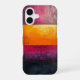 This abstract canvas is divided into horizontal bands of saturated violet, deep magenta, blazing orange, and midnight blue. The upper section blends rosy pink and plum tones, transitioning into a central strip of glowing tangerine and golden yellow before deepening into rich purple and navy. Textured brush marks, scratches, and layered paint create depth and tactile richness. Subtle hints of burgundy and indigo add complexity to the lower areas. The art style aligns with contemporary abstract expressionism and color field painting, emphasizing bold chromatic transitions and emotional resonance through layered pigment and gestural texture. The composition evokes a dramatic horizon illuminated by radiant, atmospheric light.