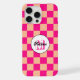à damiers carré pêche rose chaud rétro Monogram coque iphone. Personnalisez avec votre initiale et votre nom personnalisés. Cool retro à damiers géométrique carré motif design. Pêche vintage carrelage orange clair et chevalier moderne rose chaud.