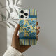 Coque iPhone Élégant bleu bleu or floral rayure Monogramme