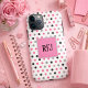 Joli et girly, ce boîtier de téléphone abordable présente des pois rose, noir et gris sur un arrière - plan blanc. Au centre se trouve une boîte monogrammée avec un modèle pour insérer vos initiales.