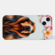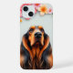 Portrait magnifiquement détaillé d'un chien, probablement une illustration d'une race de chien de chasse, placé au centre sur un fond clair. Sa fourrure est longue et ondoyante, principalement de nuances de brun et de noir. Autour du chien, une composition florale vibrante, composée de diverses fleurs de teintes douces de rose, de jaune et de blanc, ainsi que de feuilles vertes. Les fleurs créent un cadre joyeux et coloré autour du chien, améliorant l'esthétique globale de l'image. La composition a une atmosphère fantaisiste et artistique, dégageant une sensation de chaleur et d'affection.