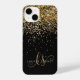 Glam Gold Parties scintillant Élégant coque iphone Monogramme. Personnalisez facilement ce design branché de boîtier de téléphone chic avec une élégante parties scintillant dorée brillante sur un arrière - plan noir. Le design comprend votre monogramme manuscrit avec de jolis tourbillons et nom.
