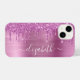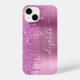 Personnalisé coque iphone élégant et girly avec parties scintillant en faux rose dégoulinant sur un arrière - plan métallique en faux rose brossé. Personnalisez avec votre nom dans un élégant script blanc tendance avec des swashes.