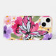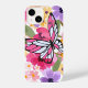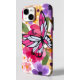 Un étui de téléphone animé avec un grand papillon stylisé dans les tons rose et blanc, sur fond de fleurs colorées. Le design comprend des fleurs dans les tons violets, jaunes et roses, créant un look animé et gai.
