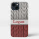 This phone case would make a great gift for your husband or boyfriend. It has a very masculine look to it with the top being grey and black chevron pattern and the bottom a reddish rust and black chevron pattern. Separating the two halves is a grey panel where you can personalize it with his name.