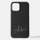 Coque iphone Monogrammé moderne Black Gold Feminine Script. Personnalisez facilement ce boîtier de téléphone moderne et élégant avec votre monogramme et votre nom personnalisés.