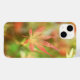Sur fond de feuilles d'été verts d'une érablière japonaise poussant vers les rouges et les jaunes d'automne, une feuille de squelette rose et d'or dérive lentement vers le sol.