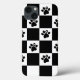 Arrière - plan à carreaux noir et blanc horizontal et empreintes de pattes noirs en carré blanc. Chaque empreinte contient un petit coeur blanc
