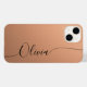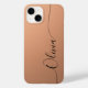 Apricot Shimmer Black Elegant Calligraphie Script Personnalisé Nom iPhone 14 Smart Phone Boîtes dispose d'un design moderne et tendance simple et élégant avec votre nom personnalisé dans élégante écriture calligraphie script typographie sur un arrière - plan shimmer d'abricot métallique. Conçu par ©Evco Studio www.zazzle.com/store/evcostudio