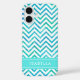Protégez votre téléphone portable avec style grâce à ce Coque Apple iPhone XS moderne et chic. Le design de couverture est composé d'un joli motif zig-zag turquoise chevron blanc et bleu, d'une bande turquoise et de votre nom ou d'un autre texte customisé dans une police de typographie blanche simple. Cette étui téléphonique élégante et tendance lui fait un cadeau élégant.