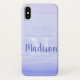Elégante et pratique coque iphone avec un design pastel violet lavande aquarelle et ornée de votre nom et de votre initiale.