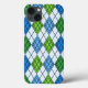 Cette coque de téléphone a un design art déco en forme de diamants réalisés à partir d'angles superposés en lignes noires colorées dans des nuances de bleu et de vert avec des lignes noires diagonales faisant ressembler le design à l'argyle