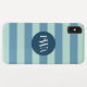 Habillez et protégez votre iPhone avec un motif rayé de style marin classique avec un élément de conception circulaire qui est personnalisé monogrammed avec vos initiales premier, milieu et nom de famille dans une police Serif élégante. Couleurs bleu marine.