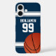 Voulez-vous ce design dans une combinaison de couleurs différente ? Veuillez nous contacter par l'intermédiaire de notre boutique GiftsBonanza et nous serons heureux de vous aider dans votre demande personnalisée. Parfait pour le ventilateur de basket ou le joueur de basket dont les couleurs d'équipe sont bleu foncé et blanc, avec un style de maillot de basket sport en bleu foncé avec rayures blanches et texte personnalisable pour leur nom et leur numéro. Un basket-ball est également présenté dans le design.