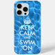 Personnalisable "Keep Calm and Swim On" avec texte blanc contre photo teintée d'eau bleue de la piscine.