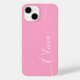 Pink Elegant White Calligraphy Script Personnalisé Nom iPhone 14 Smart Phone Boîtes dispose d'un design moderne et tendance simple et élégant avec votre nom personnalisé dans élégante calligraphie manuscrite typographie de script sur un arrière - plan rose. Conçu par ©Evco Studio www.zazzle.com/store/evcostudio