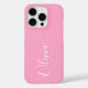 Pink Elegant White Calligraphy Script Personnalisé Nom iPhone 16 Pro Smart Phone Boîtes dispose d'un design moderne et tendance simple et élégant avec votre nom personnalisé dans élégante calligraphie manuscrite typographie de script sur un arrière - plan rose. Conçu par ©Evco Studio www.zazzle.com/store/evcostudio