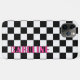 Fun funky noir et blanc, et rose chaud drapeaux de course vérifier la conception motif. Avec espace pour personnaliser ou customiser avec un nom de votre choix dans les couleurs vives blanc et noir. Conception amusante, élégante, élégante et éclectique pour la fashionista artistique, la diva de mode artsy, populaire branchiste, style rétro vintage, et amoureux abstrait de motifs numériques géométriques qui veut protéger leur téléphone de la poussière et la saleté, l'usure et la déchirure. Cette conception est disponible pour les coques de téléphones cellulaires Apple iPhone 6, 7 et 8 Plus, 10 ou X, XR, XS, 11, 12, 13 Mini, 14, 15 Plus et Pro Max. Montrez votre style, regardez à la mode et sentez élégant avec un design unique sur un appareil mobile de votre choix.