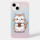 Arrière - plan simple à dégradé pastel avec un adorable chat tenant une tasse de café dans le style vectoriel propre. Idéal pour l'impression de boîtier téléphonique, pas de maquette incluse.
