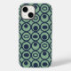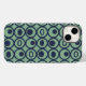 Ce boîtier téléphonique a une conception géométrique de cercles en rangs avec des cercles ou ovales à l'intérieur en bleu sur un champ de vert.