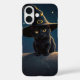 Chat noir magique assis sur une lune de croissant avec un casquette sorcier. Un design de téléphone Halloween charmant pour les amoureux de les chats et les nuits éffrayantes.