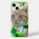 Photo d'un chat gingembre aux yeux vert pâle assis dans une longue herbe verte sur des coques électroniques et des manches.