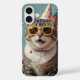 Un cas de téléphone mignon et drôle montrant un chat avec un casquette de fête et des lunettes de soleil au milieu des confettis. Parfait pour les fêtes et les amoureux de les chats.