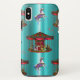 Un coque iPhone X rétro à thème carnavalesque avec un joli motif de chevaux vintages de carrousel et des manèges, le tout sur un arrière - plan bleu coloré.
